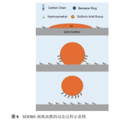如圖8所示,SDDBS剝離油膜機(jī)理可從以下三個(gè)方面進(jìn)行闡釋,首先SDDBS吸附在油水界面上降低了油水界面張力;其次,SDDBS的二羥基通過氫鍵作用強(qiáng)化了其與巖石表面吸附,磺酸基團(tuán)富集于巖石表面使得巖石表面由親油轉(zhuǎn)變?yōu)閺?qiáng)親水,極大地增加了油滴在巖石表面接觸角,降低粘附功而使得油膜易于剝離;最后,由于SDDBS在油水界面和巖石表面同時(shí)吸附,增加剝離后油滴與巖石表面間的靜電斥力,使得剝離后油膜不易重新粘附壁面,實(shí)現(xiàn)高效剝離。
