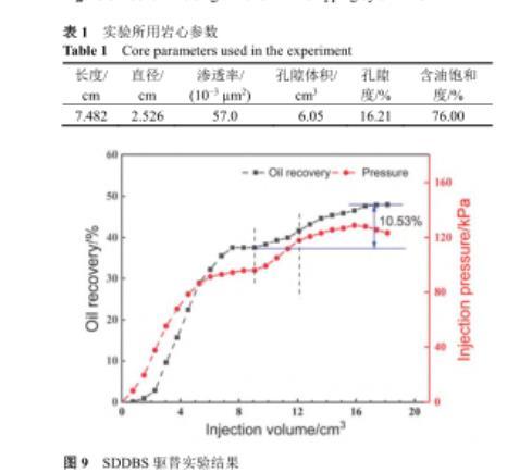 結(jié)合上述研究,選取0.02%(w)SDDBS溶液作為驅(qū)油劑進(jìn)行巖心動(dòng)態(tài)驅(qū)替實(shí)驗(yàn).本實(shí)驗(yàn)使用的巖心參數(shù)如表1所示.驅(qū)替實(shí)驗(yàn)共分為三個(gè)過(guò)程:模擬地層水驅(qū)、表面活性劑驅(qū)、后續(xù)模擬地層水驅(qū).驅(qū)替結(jié)果如圖9所示,初期地層水驅(qū),當(dāng)采出液含水率>98%時(shí),計(jì)算采收率為37.36%.當(dāng)注入3.025 cm3 SDDBS溶液后采收率提高至41.67%,注入壓力升高.恒溫保持12 h后進(jìn)行后續(xù)水驅(qū),注入壓力逐漸升高,且當(dāng)采出液含水率>98%時(shí),計(jì)算采收率為47.89%.說(shuō)明SDDBS溶液驅(qū)在水驅(qū)基礎(chǔ)上提高采收率10.53%,具有優(yōu)異的驅(qū)油效果.