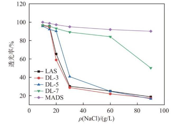 在許多工業(yè)應用中,水中含有大量的鹽類,例如在石油天然氣開采、海洋設備清洗或污水處理等場景中[2,7]。耐鹽型表面活性劑能夠保持在高鹽環(huán)境下的化學穩(wěn)定性,避免沉淀或失效,確保其清洗能力不受影響,因此探究表面活性劑的耐鹽性有重要意義。圖3給出了LAS、DL-n、MADS的耐鹽性透光率圖,可以看出,LAS的耐鹽性最差,20 g/L NaCl時溶液渾濁,而MADS的耐鹽性最好,隨著混合磺酸鹽中MADS含量的增加,混合磺酸鹽的耐鹽性呈升高趨勢,說明MADS含量的提高有利于提高耐鹽性,這可能是由于無機鹽對陰離子表面活性劑的作用體現(xiàn)在離子頭基水化層的破壞作用,MADS分子中的雙磺酸結構電荷密度大,屏蔽了NaCl的作用。
