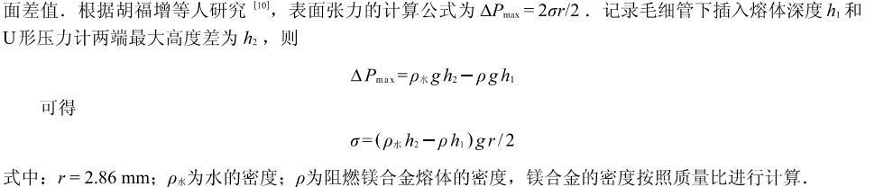 工業(yè)純Mg熔化后在750℃左右加入Mg-30%Ca和Mg-30%Ce中間合金,待金屬完全熔化后攪拌均勻,去除表面熔渣,保溫10 min后進(jìn)行表面張力的測(cè)量.測(cè)量時(shí)首先打開(kāi)氬氣瓶,通過(guò)一系列的量程裝置、U形管兩邊液面波動(dòng)情況和熔體中產(chǎn)生氣泡的速度來(lái)調(diào)節(jié)氣體流量大小,以阻燃鎂合金熔體表面每分鐘產(chǎn)生8~10個(gè)氣泡為準(zhǔn)。記錄下毛細(xì)石英管插入到熔體內(nèi)部的深度和U形管兩端的最大液面差值。