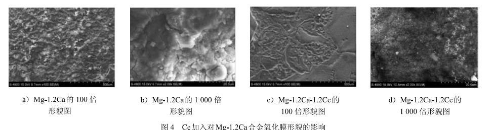 圖4 Ce加入對(duì)Mg-1.2Ca合金氧化膜形貌的影響