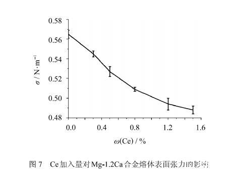 本研究測(cè)量了不同Ce含量對(duì)Mg-1.2Ca鎂合金熔體表面張力的影響.熔體表面張力的測(cè)量在730℃、大氣壓下進(jìn)行,采用最大氣泡壓力法.其測(cè)試結(jié)果如圖7所示,可以看出隨著Ce含量的增加,Mg-1.2Ca-xCe熔體表面張力不斷下降.這與Ce含量在鎂合金熔體表面富集,提高熔體表面表面活性有直接關(guān)系.