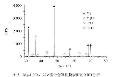 從式(9)、(12)、(15)可知,從熱力學(xué)上講,在氧化開始時(shí)Mg、Ca和Ce 3種元素均有可能發(fā)生氧化;從式(16)、(17)、(18)可以看出,由于活度的影響,式(4)、(5)、(6)所述的置換反應(yīng)在元素分布均勻的情況下不可能發(fā)生;從式(8)、(11)、(14)各氧化物分解壓的計(jì)算,MgO、CaO和Ce_2 O_3分解壓的大小順序?yàn)?PMgO^0>PCaO^0>PCe,O^0.此外,對(duì)氧化膜進(jìn)行X射線衍射結(jié)果表明(圖5),氧化膜中并未出現(xiàn)新的復(fù)雜氧化物,可見MgO、CaO和Ce_2 O_3是互不固溶的.按熱力學(xué)規(guī)律,此時(shí)合金將分層氧化,即氧化膜外層氧壓高生成的氧化物其分解壓也大,氧化膜內(nèi)層氧壓低生成的氧化物其分解壓也小。所以Mg-1.2 Ca-1.2 Ce來說,將按照這樣的順序來氧化:最外層是MgO,其次是CaO,最內(nèi)層是Ce_2 O_3.至此,初始的保護(hù)性氧化膜形成.