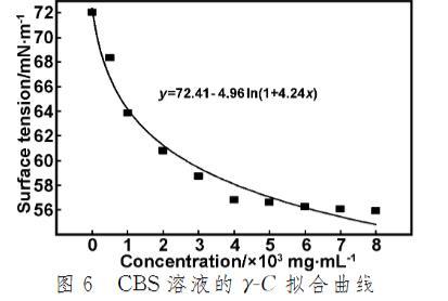 (1)CBS溶液的表面張力隨濃度的增大而降低,最后趨于平緩,此時表面張力為55.92 mN/m,并得出其臨界膠束濃度為4.0×10^-3 mg/mL。