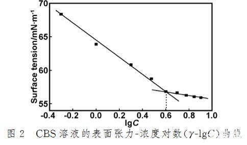 圖2 CBS溶液的表面張力-濃度對數(shù)(γ-lg C)曲線