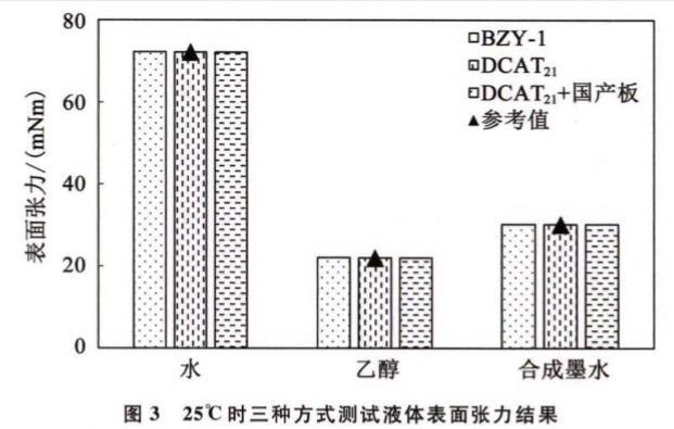 使用BZY-1表面張力儀(原配國產(chǎn)鉑金板)、表面張力儀(原配進口鉑金板)和表面張力儀(選配國產(chǎn)鉑金板)對水、無水乙醇、合成墨水進行表面張力測試,測試結(jié)果如圖3所示。
