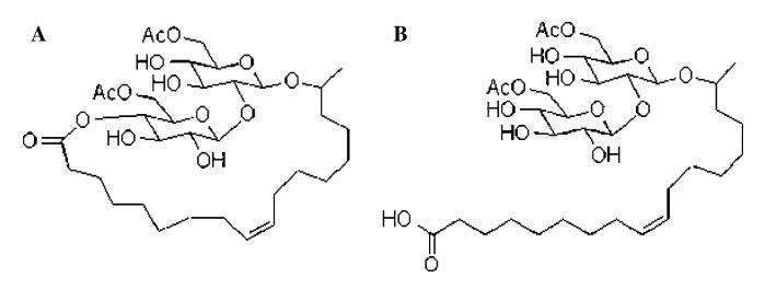 通常,槐糖的60-和600-羥基被乙酰化,脂肪酸鏈長度在16到18個碳之間變化(一個例外是由R.bogoriensis合成的SLs,其中包括22和24個碳的脂肪酸側(cè)鏈;Nun?ez et al.2004); 并且可能是飽和的或不飽和的。 此外,SLs的優(yōu)選結(jié)構(gòu)構(gòu)象為內(nèi)酯,其中脂肪酸的羧基在碳400處酯化為二糖環(huán),盡管在某些情況下,SLs的脂肪酸可能保持游離酸、開鏈形式。