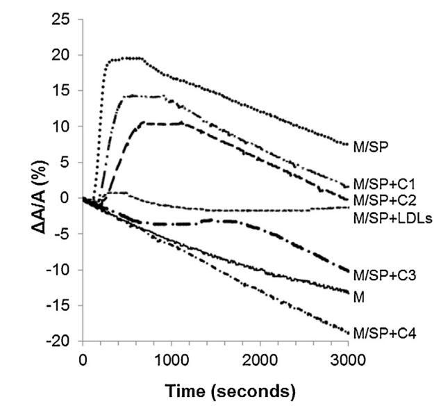 圖5。注入(…)后,由單層(M)覆蓋并在不含(-)額外分子的緩沖液上形成的界面的相對(duì)表面積隨時(shí)間的變化SP(26.6±1.5 mg蛋白質(zhì))、SP(26.6±1.5 mg蛋白質(zhì))和不同濃度(··-)C1、(·-)C2的脂質(zhì)體的混合物,(·-)C3和(·-)C4(分別為1.17±0.02 mg、2.18±0.02 mg、4.37±0.02 mg和6.55±0.02 mg脂質(zhì))和(---)LDL(4.6 mg PC)和SP(26.6±1.5 mg蛋白質(zhì))的混合物。空氣-緩沖界面處的溫度為34℃。表面壓力保持在25 mN/m。