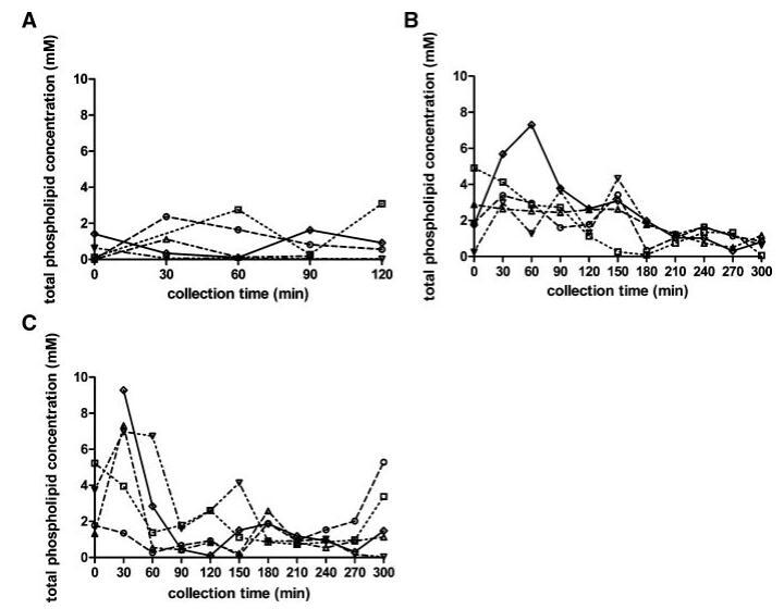 圖4。在禁食(A)、喂食(B)和高脂喂食(C)狀態(tài)下,總磷脂濃度(mM)隨餐后時間的變化而變化。(--?--)主題1(··?··)主題2,(·–·)△·–·)主題3,(·-·▽·–·)主題4,(-◇–)科目5。