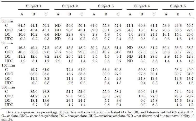 表3。餐后不同時間的個體相對膽汁鹽池成分(%)a