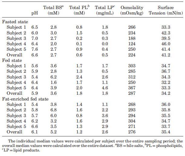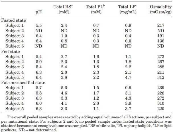 攝入Sure Plus1或Scandishake Mix1后前2小時的滲透壓通常高于禁食狀態(tài)下的HIF,盡管禁食狀態(tài)和兩種喂食狀態(tài)之間未達(dá)到顯著差異。禁食狀態(tài)滲透壓值一般為低滲透,或接近等滲透值。224 mOsm/kg的總體中值為低滲透性,與Brouwers等人1和Deferme等人報告的人類十二指腸吸出物的平均滲透壓一致。,38但高于Perez de la Cruz Moreno等人報告的平均值。24在給藥(n?3)后,在混合樣品中獲得的滲透壓較低,與Kalantzi等人11和Gisolfi等人報告的滲透壓較好。39在喂食和富含脂肪的喂食狀態(tài)下均發(fā)現(xiàn)高滲值,尤其是在消化的前3小時。在喂食和富含脂肪的喂食狀態(tài)下,總的中位數(shù)滲透壓為等滲透壓(分別為285和278 mOsm/kg)。進食后180分鐘內(nèi)較高的滲透壓與膽汁鹽濃度、磷脂或脂質(zhì)產(chǎn)物總量無關(guān)。Kalantzi等人19將吸入十二指腸內(nèi)容物的高滲值歸因于雙糖和果糖復(fù)合碳水化合物的存在,以及后者的緩慢吸收。在本研究中未確定總碳水化合物水平,因此,該陳述無法驗證。