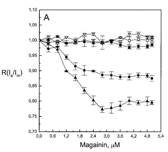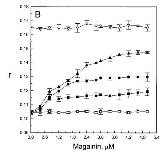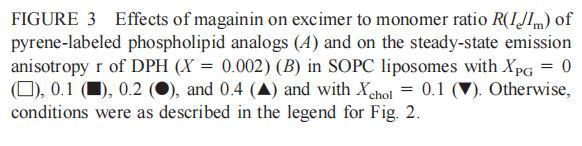 有趣的是,在存在酸性磷脂的情況下,肌動(dòng)蛋白/脂質(zhì)的摩爾比(在該摩爾比下,肌動(dòng)蛋白的初始增量趨于穩(wěn)定)分別為1:21、1:16和1:12.5,對(duì)應(yīng)于XPG=0.1、0.2和0.4(圖2A),分別產(chǎn)生1:2、1:3和1:5的肌動(dòng)蛋白/磷脂化學(xué)計(jì)量比。同時(shí),DPH的初始r增量在magainin/脂質(zhì)摩爾比為~1:30、1:12和1:5時(shí)趨于平穩(wěn)(XPG分別為0.1、0.2和0.4),對(duì)應(yīng)于大約1:3、1:2.5和1:2的magainin/PG化學(xué)計(jì)量比(圖3)。據(jù)報(bào)道,在這些肽/脂質(zhì)摩爾比下,magainin可插入含酸性磷脂的膜中(Ludtke等人,1994年)。此外,已經(jīng)證明,雙分子層中magainin的=-螺旋的方向取決于肽與脂質(zhì)的摩爾比,在上述化學(xué)計(jì)量比下,螺旋應(yīng)垂直于膜表面插入,在含PG的膜中形成孔(Ludtke等人,1996)。這些孔不僅由兩親螺旋的極性面組成,而且還由脂質(zhì)的極性頭基組成,內(nèi)外單層通過這些孔襯脂質(zhì)是連續(xù)的。膜中的這種結(jié)構(gòu)可能會(huì)降低探針芘部分微環(huán)境的極性,從而提高其量子產(chǎn)率。有趣的是,當(dāng)XPG>0.1時(shí),magainin 2逐漸降低Ie/Im值(圖3 A),這與增強(qiáng)的酰基鏈順序減少脂質(zhì)側(cè)向擴(kuò)散的速率一致。然而,由于magainin 2已經(jīng)在XPG=0.1時(shí)增加了r,Ie/Im沒有變化,我們可以得出結(jié)論,PPDPG探針向微區(qū)富集以及其橫向擴(kuò)散的減少正在發(fā)生。