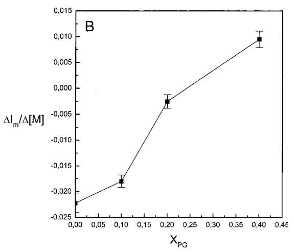 繼上述單層研究之后,有興趣探索肽對(duì)脂質(zhì)動(dòng)力學(xué)的影響。這是通過使用熒光光譜和不同脂質(zhì)成分的LUV完成的,記錄芘標(biāo)記的熒光磷脂類似物PPDPC或PPDPG的發(fā)射光譜(均為X=0.01)。對(duì)于SOPC LUV,添加magainin 2導(dǎo)致芘熒光顯著猝滅,芘單體和準(zhǔn)分子發(fā)射強(qiáng)度平行降低,如Im所示(圖2)。作為XPG的一項(xiàng)功能,還研究了馬蓋寧2與脂質(zhì)體結(jié)合的后果。當(dāng)XPG從0.1增加到0.4時(shí),觀察到由于magainin 2在398 nm處逐漸增強(qiáng)的Im(RFIm),而Im的初始增量在明確定義的PG/magainin 2化學(xué)計(jì)量比~2、3和5時(shí)趨于平穩(wěn)(圖2 A)。在這個(gè)初始階段之后,直到給定的化學(xué)計(jì)量比,還有第二個(gè)過程,其斜率也隨著XPG的增加而增加(圖2b)。在XPG=0和0.1時(shí),Magainin 2僅引起Ie/Im的輕微變化,而在XPG=0.2和0.4時(shí),分別減少10%和25%是明顯的(圖3 A)。為了區(qū)分脂質(zhì)動(dòng)力學(xué)中兩種性質(zhì)不同的變化,即側(cè)向遷移率和微結(jié)構(gòu)域形成,作為上述Ie/Im變化的根本原因,我們還通過測(cè)量DPH的熒光各向異性r來評(píng)估酰基鏈順序的變化(圖3 B)。在缺乏酸性磷脂的情況下,Magainin 2幾乎不會(huì)引起r的變化(圖3B)。然而,隨著XPG的增加,加入magainin 2后脂質(zhì)堆積和酰基鏈順序逐漸增加(圖3b),XPG=0.4時(shí),r最大增加1.4倍。值得注意的是,XPG=0.1時(shí)Ie/Im沒有變化以及酰基鏈順序的增加表明PPDPG正在發(fā)生微觀富集。有趣的是,在存在膽固醇(Xchol=0.1)的情況下,由于馬蓋寧2的作用,Im和Ie都顯著降低,Ie/Im的變化不顯著(圖2A和3A)。如前所述(van Ginkel et al.,1989),添加肽前r的增加(圖3 B)揭示了通過在膜中摻入膽固醇而增強(qiáng)的膜順序。然而,在膽固醇存在的情況下,magainin 2對(duì)r沒有進(jìn)一步的影響(Xchol=0.1,圖3b)。