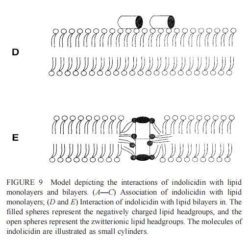 吲哚西丁只含有13個(gè)氨基酸,因此太短,無法跨越雙層。然而,該肽可以作為聚集物或帶有相關(guān)酸性磷脂的頭尾二聚體橫跨雙層(圖9 E),從而導(dǎo)致膜不穩(wěn)定性。已經(jīng)證明,吲哚西丁能夠通過穿過外膜殺死革蘭氏陰性細(xì)菌,并通過形成通道破壞細(xì)胞質(zhì)膜(Falla et al.,1996)。與magainin 2的作用相比,吲哚青霉素誘導(dǎo)的內(nèi)吞小泡較小(圖7)可能反映了這些肽與脂質(zhì)相互作用的不同模式。一些吲哚肽分子可能會(huì)轉(zhuǎn)移到膜的內(nèi)部小葉中。除了具有廣譜的抗真菌和抗菌活性外,吲哚西丁對(duì)哺乳動(dòng)物細(xì)胞也有毒性(Schluesener等人,1993年;Ahmad等人,1995年)。有趣的是,吲哚西丁對(duì)SOPC和SOPC膽固醇巨型脂質(zhì)體的作用不同。在這一階段,根本原因尚不確定,可能與膽固醇對(duì)雙層結(jié)構(gòu)以及吲哚肽在膜中的取向的影響有關(guān)。因此,需要進(jìn)一步的研究來闡明膽固醇對(duì)吲哚肽膜結(jié)合的影響。