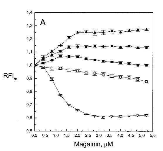 除上述相似性外,當(dāng)使用芘標(biāo)記的脂質(zhì)類似物研究酸性磷脂對(duì)脂質(zhì)動(dòng)力學(xué)的影響時(shí),兩種肽之間也存在明顯差異。Magainin 2導(dǎo)致兩性磷脂組成的LUV的芘發(fā)射顯著猝滅(圖2A)。然而,在PG存在的情況下,芘的單體強(qiáng)度增加,XPG逐漸增加了這種效應(yīng)的幅度(圖2A)。圓二色性、拉曼光譜、傅里葉變換紅外光譜和固態(tài)核磁共振研究表明,馬蓋寧在與脂質(zhì)雙層結(jié)合時(shí)采用螺旋構(gòu)象(Matsuzaki等人,1989年、1991年;Williams等人,1990年;Jackson等人,1992年;Bechinger等人,1993年;Wieprecht等人,1997年;Hirsh等人,1996年)。magainin 2對(duì)兩種膜的這些不同影響可能是由于1)通過與肽的帶正電基團(tuán)(例如賴氨酸的?氨基)直接接觸使芘熒光猝滅,或2)插入雙層的=-螺旋肽改變熒光團(tuán)的微環(huán)境,與層平面平行,如上所述。然而,在PG存在的情況下,肽的正電荷應(yīng)在與酸性磷脂形成靜電復(fù)合物時(shí)被中和,從而減少由于π-陽離子相互作用導(dǎo)致的芘熒光猝滅。