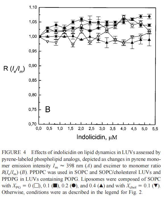 雖然熒光光譜顯示,馬蓋寧2和吲哚西啶對(duì)脂質(zhì)動(dòng)力學(xué)的影響存在明顯差異,但也存在一些明顯的相似之處。因此,DPH各向異性r的增加表明,在存在酸性磷脂的情況下,這兩種肽都會(huì)導(dǎo)致酰基鏈順序的增加,這種影響的程度隨著XPG的增加而增加(圖3b和5b)。同樣,在膽固醇存在的情況下,兩種肽對(duì)芘熒光的有效猝滅也很明顯(圖2a和4a)。這可能與膽固醇的OH基團(tuán)和馬蓋寧的E19殘基之間的相互作用有關(guān)(Tytler等人,1995年),該肽在膜中具有跨膜取向。當(dāng)Xchol=0.1時(shí),r值的增加是由于吲哚西丁所致,而馬加寧則無影響。這表明,在膽固醇存在的情況下,吲哚肽可能采用跨雙層取向,其長軸垂直于雙層平面。