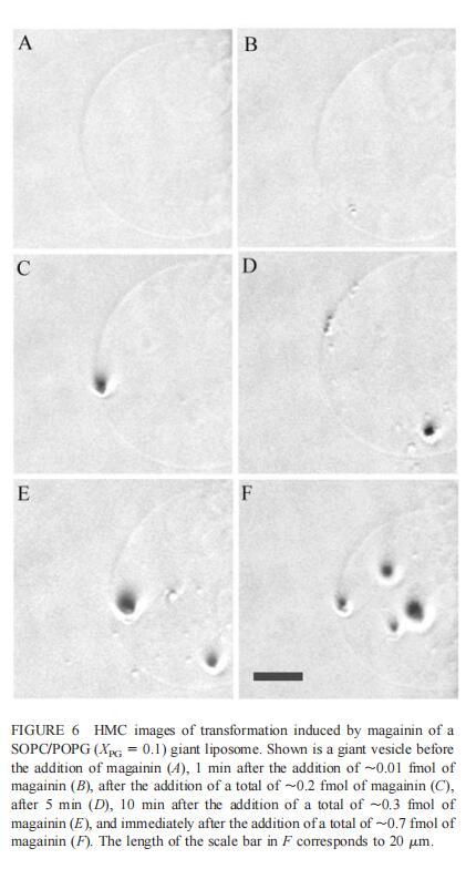 由于上述magainin 2和吲哚西啶對(duì)單層和LUV具有明顯的脂質(zhì)成分依賴性作用,因此有興趣使用巨型脂質(zhì)體比較這些肽對(duì)宏觀膜的三維拓?fù)浣Y(jié)構(gòu)的影響,無論是否含有PG,都可以在交流電場(chǎng)中形成由SOPC組成的巨大脂質(zhì)體。即使暴露于大量肽(~2 fmol,~4 pl=200次重復(fù)注射,數(shù)據(jù)未顯示),SOPC膜也不受magainin 2的影響。同樣,由SOPC和膽固醇(Xchol=0.1)組成的巨大脂質(zhì)體也不受此量的馬蓋寧2的影響(數(shù)據(jù)未顯示)。然而,在存在POPG(XPG=0.1)的情況下,已經(jīng)~0.01 fmol(單次~20 fl注射)的magainin 2應(yīng)用于巨大囊泡表面,顯著影響巨大脂質(zhì)體膜的拓?fù)浣Y(jié)構(gòu)(圖6 B)。更具體地說,在~1分鐘內(nèi),小顆粒(θ≈0.9米)出現(xiàn)在巨大的囊泡內(nèi)。隨后注射高達(dá)~0.1 fmol(約200 fl)的magainin 2不會(huì)引起進(jìn)一步的可見變化。在總共添加約0.2 fmol的肽后,膜開始起伏,形成致密顆粒(θ≈4 m)在巨大脂質(zhì)體內(nèi)可見(圖6 C)。在~5分鐘內(nèi),幾個(gè)小顆粒(θ≈0.9 m)出現(xiàn)在巨大脂質(zhì)體膜的內(nèi)表面(圖6 D)。隨后,大多數(shù)小顆粒進(jìn)入巨大囊泡的內(nèi)腔。這些內(nèi)吞小泡似乎在巨大脂質(zhì)體內(nèi)自由移動(dòng),在隨后30分鐘的觀察中沒有進(jìn)一步的變化。進(jìn)一步注射magainin 2,提供總共0.3 fmol的肽,引起類似內(nèi)吞作用的過程,出現(xiàn)直徑約8 m的致密顆粒(圖6 E)。約10分鐘后,巨大脂質(zhì)體內(nèi)約0.9-m顆粒的數(shù)量繼續(xù)增加。偶爾,這些顆粒也出現(xiàn)在巨大囊泡的外表面,并釋放到外部緩沖液中(圖6 E)。隨后添加magainin 2(~0.7 fmol)使膜不穩(wěn)定并誘導(dǎo)進(jìn)一步的囊泡形成(圖6 F)。這些內(nèi)吞囊泡在巨大脂質(zhì)體內(nèi)彼此分離,巨大囊泡的大小明顯減小(圖6f)。最終,在進(jìn)一步添加magainin 2(高達(dá)~1.5 fmol)后,巨大的脂質(zhì)體膜崩塌。上述形態(tài)學(xué)變化具有高度的可重復(fù)性。