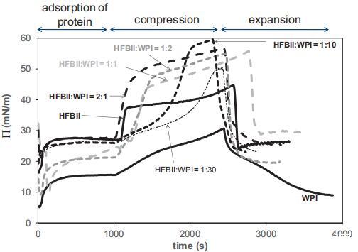 值得注意的是,對于純HFBII,П–A等溫線在連續(xù)的壓縮膨脹循環(huán)中不會發(fā)生變化,這再次表明HFBII不可撤銷地附著在界面上,幾乎沒有任何構(gòu)象變化。對于純WPI和1:1混合物,П–A等溫線略微向較小區(qū)域移動(dòng),這表明由于WPI分子的構(gòu)象變化、多層形成或如前所述,由于WPI的解吸,表面重排的可能性較小。
