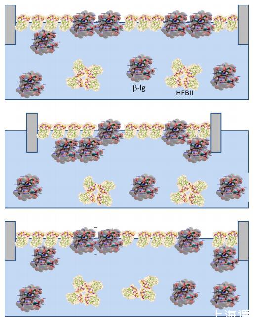 圖7。重復(fù)壓縮和膨脹后HFBII:WPI混合層結(jié)構(gòu)形成示意圖。請注意,乳清蛋白的主要成分BLG僅在此處顯示。壓縮:BLG的一部分從表面排出,形成一個(gè)子層。膨脹:BLG的一部分停留在亞表層,而另一部分可能重新吸附到主層。頂面存在HFBII的凈濃度。