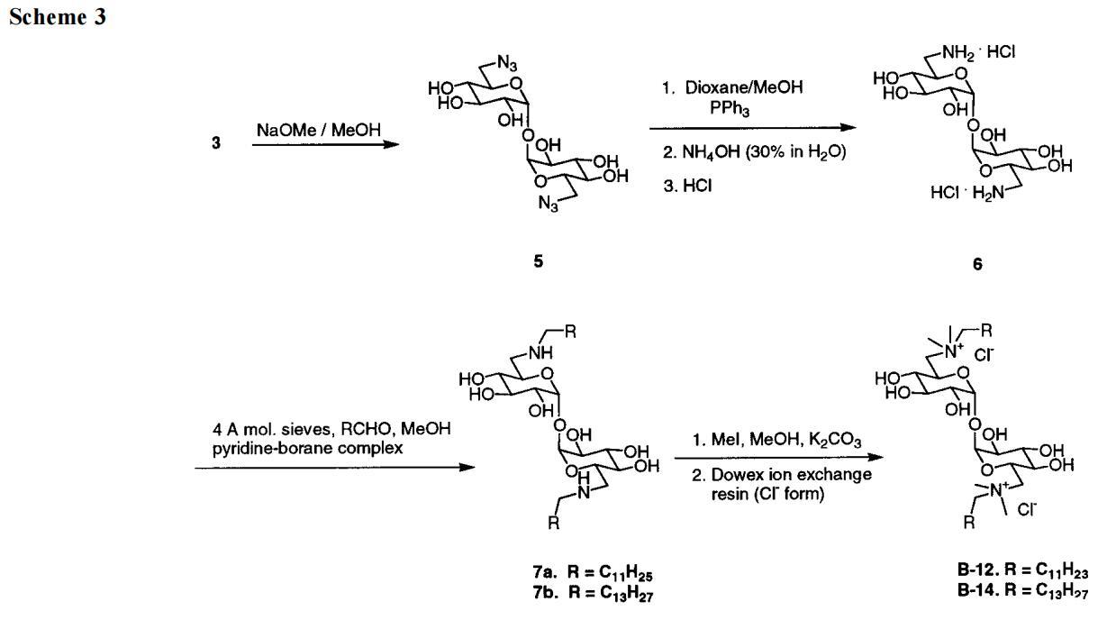 方案2和方案3以及實驗部分詳述了我們獲得A系列和B系列海藻糖雙子的方法。另外幾條評論有助于美化這一信息。B型海藻糖雙子最明顯的先驗途徑是用長鏈叔胺直接取代2的甲苯磺酰化基團。盡管沿著這些路線進行了多次嘗試,但只獲得了分解產(chǎn)物或起始材料。然而,如方案2所示,我們成功地用疊氮化合物取代了2的兩個甲苯磺酰化物,得到了3。此處采用文獻程序28,但出于安全考慮,HMPA被DMPU取代作為溶劑。然后,雙疊氮化物3經(jīng)過Staudinger反應25,29,在一個步驟中得到長鏈雙酰胺4a-g,而該長鏈雙酰胺4a-g只需脫保護即可獲得a系列雙子。在方案3中,脫保護糖5的疊氮化物還原將化合物轉(zhuǎn)化為二伯胺鹽酸鹽6。長鏈醛與6和吡啶硼烷絡合物30的還原胺化得到海藻糖衍生物7。使用NaBH3-CN作為還原劑,該反應的產(chǎn)率很低。在用甲基碘化物將7甲基化,然后進行離子交換(以促進純化和提高溶解性)之后,我們得到了B系列海藻糖雙子。