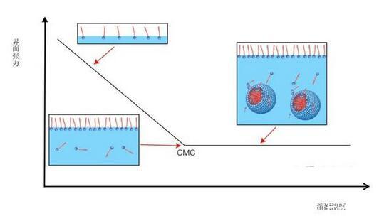 但是當(dāng)濃度超過一個點時,表面活性劑會開始抱團,形成膠束,界面張力不再下降,這個濃度叫做臨界膠束濃度。