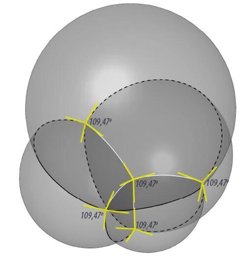 如果我們從平面的泡泡筏推演到立體的“泡泡堆”,結(jié)果也是類似的。假如你用吸管對著一碗肥皂水吹氣,吹起一堆泡沫,你會看到,當(dāng)泡泡堆積在一起之后,它們四面邊界相交于一個點,夾角約為109°——沒錯,這個角度就是正四面體中心到各頂點連線的夾角。