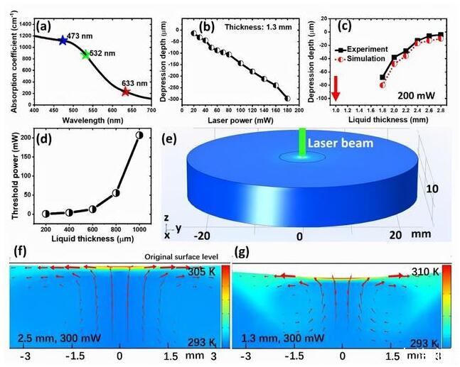 他們發(fā)現(xiàn),液體的厚度、表面張力的溫度系數(shù)、熱導、比熱容、吸光性和粘度等物理參數(shù),都會對光致液體形變產(chǎn)生重要影響,尤其是吸光系數(shù)和液體的表面張力溫度系數(shù)。