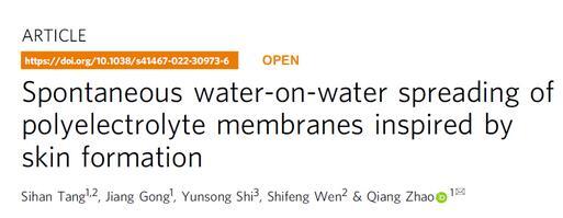 近期,趙強教授課題組在《Nature Communications》在線刊發(fā)了該領(lǐng)域的新進展(Spontaneous water-on-water spreading of polyelectrolyte membranes inspired by skin formation,Nat.Commun.13,3227,2022.),提出了一種聚電解質(zhì)水溶液在水面自發(fā)鋪展,形成多孔膜的機制。文章第一作者是化學(xué)與化工學(xué)院2020屆碩士畢業(yè)生湯思晗,合作單位包括華中科技大學(xué)材料科學(xué)與工程學(xué)院,協(xié)和醫(yī)院。研究得到國家自然科學(xué)基金,國家重點研發(fā)計劃和三峽實驗室開放基金的支持。