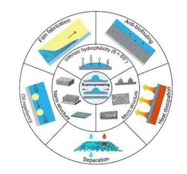 近日,中國(guó)科學(xué)院院士、中科院理化技術(shù)研究所研究員江雷和研究員田野團(tuán)隊(duì)在Accounts of Chemical Research上,以Bioinspired superspreading surfaces:from essential mechanism to application為題,發(fā)表綜述論文,系統(tǒng)提出了超鋪展概念及其表征方法,綜述了超鋪展表面的本質(zhì)機(jī)理及研究進(jìn)展,總結(jié)了超鋪展的應(yīng)用領(lǐng)域,展望了領(lǐng)域內(nèi)遺留的重大挑戰(zhàn)及發(fā)展方向。