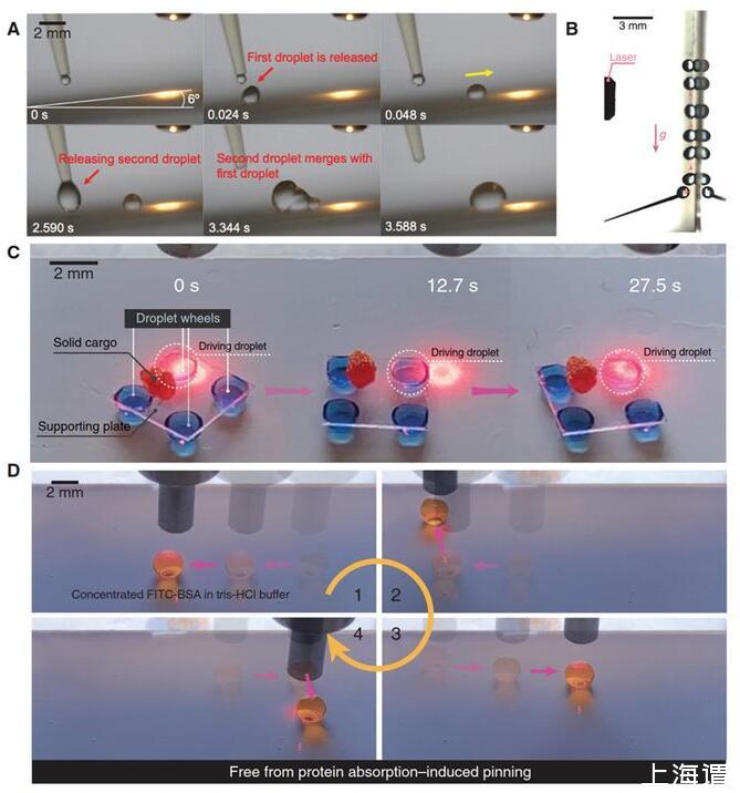 為解決這些挑戰(zhàn),香港大學(xué)王立秋教授研究團(tuán)隊(duì)提出了一種無(wú)污染的光電微流控技術(shù),通過(guò)把光熱薄膜、熱釋電晶體和超疏液涂層三種功能材料整合在一起,僅用單束光即可移動(dòng)、切割、融合、分配任意液滴,不需要復(fù)雜的微納加工或電極,就可以精確操控表面張力18.9-98.0mN/m、體積1nl-1000ul的任意液體而沒(méi)有液體殘留,不僅解決了現(xiàn)有數(shù)字微流控平臺(tái)上的蛋白質(zhì)等生物分子易于吸附的問(wèn)題,還能利用光束精準(zhǔn)遙控帶有四個(gè)液滴輪的載貨機(jī)器人作為貨物搬運(yùn)工實(shí)現(xiàn)對(duì)微小固體的傳輸。該技術(shù)以題為“Photopyroelectric microfluidics”的論文發(fā)表在《Science Advances》上,香港大學(xué)王立秋教授和唐欣博士為論文的通訊作者,李威博士為第一作者。