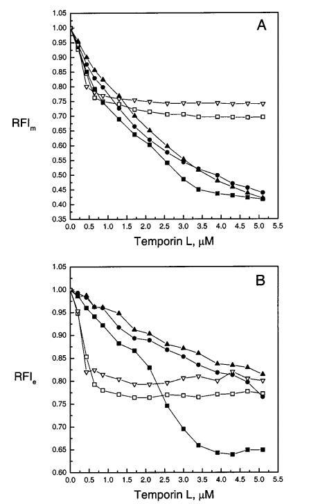 圖4:通過芘標(biāo)記的磷脂PPDPC(X)0.01的熒光評(píng)估顳葉素L對(duì)LUV中脂質(zhì)動(dòng)力學(xué)的影響,分別顯示為芘單體和準(zhǔn)分子發(fā)射強(qiáng)度Im(圖A)和Ie(圖B)的變化。脂質(zhì)體由SOPC組成,XPOPG為0(0)、0.10(9)、0.20(b)和0.40(2),Xchol為0.10(3)。每個(gè)數(shù)據(jù)點(diǎn)代表三次測(cè)量的平均值。標(biāo)準(zhǔn)偏差小于0.02,為清晰起見,未顯示。否則情況如圖2圖例所示。