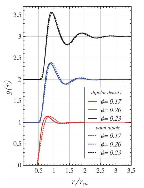 在第一個(gè)峰值位置和g(r)開始偏離零的小區(qū)域觀察到輕微差異。當(dāng)系統(tǒng)更加結(jié)構(gòu)化時(shí),協(xié)議會(huì)得到改善。特別是,對(duì)于弱相互作用域,差異開始明顯。這些偏差是由于點(diǎn)偶極力在接觸時(shí)趨于有限值,而在偶極密度情況下,它會(huì)發(fā)散。因此,硬盤相互作用與點(diǎn)偶極子模型有關(guān)。