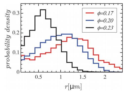 圖4具有不同凝聚面積分?jǐn)?shù)的單分子膜的域半徑分布。
