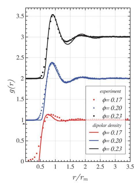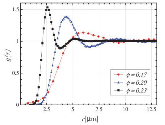 圖5顯示了三個(gè)實(shí)驗(yàn)系統(tǒng)的徑向分布函數(shù)。在所有情況下,g(r)類似于液體,顯示出明確的第一峰(在rmax處),其表征了第一配位殼層,即最近鄰。此外,對(duì)于f=0.20和f=0.23的系統(tǒng),觀察到與第二配位殼對(duì)應(yīng)的標(biāo)記的第一最小值和第二最大值。由于“強(qiáng)”排斥作用,最近鄰距離遠(yuǎn)大于平均磁疇直徑。因此,硬核斥力不是結(jié)構(gòu)的決定因素,系統(tǒng)的特征長度是平均幾何距離rm=r 1/2。