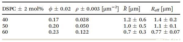 表1考慮的單分子膜的凝聚面積分?jǐn)?shù)、數(shù)密度、平均半徑和有效半徑。誤差由標(biāo)準(zhǔn)差確定,但f除外,f是通過改變閾值確定的,如實(shí)驗(yàn)部分所述