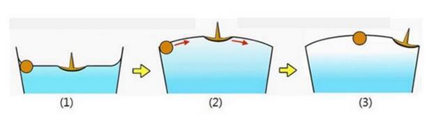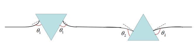 上圖便是水上兩個(gè)漂浮小球的吸引與排斥的判斷方法。值得注意的是,我們這里并沒有提及小球的浸潤性,也就是說,浸潤性與橫向毛細(xì)力的性質(zhì)并不直接相關(guān)。實(shí)際上,橫向毛細(xì)力還可以分為漂浮橫向毛細(xì)力和浸沒橫向毛細(xì)力。我們討論的情況是漂浮橫向毛細(xì)力,由小球的重力引起,題主的所說的浸潤性應(yīng)該換為小球的輕重(與水相比)。例如圖(a)里是兩個(gè)比水重的小球,表面張力將其往上拉。圖(b)是兩個(gè)比水輕的小球,表面張力將其往下拉。表面張力的方向恰好就對應(yīng)了前述接觸線處液面的傾斜角。題主的所要表達(dá)的意思其實(shí)是:
