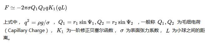 具體過程大家可以閱讀文末的參考文獻(xiàn),這里直接給出在小顆粒和液面小變形下假設(shè)下,兩小球之間橫向毛細(xì)力的表達(dá)式,