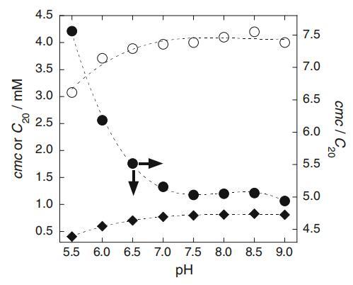 圖4 cmc、C20和cmc/C20比值與pH的關(guān)系圖:白色圓圈cmc、黑色菱形C20、黑色圓圈cmc/C20