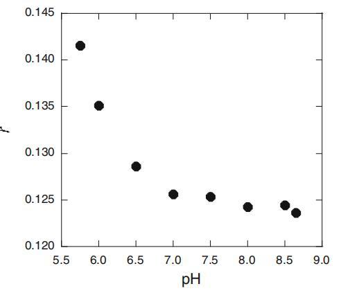 圖8:若丹明B在SLAS膠束(r)處的熒光各向異性與CS=25mM時pH的關(guān)系圖