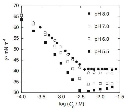 在圖1中,僅含SLAS且不含任何緩沖液的水溶液的界面張力(γ)與總SLAS摩爾濃度(CS)的對數(shù)作圖。如圖所示,盡管SLAS仔細重結(jié)晶,但γ值出現(xiàn)了異常的最小值。然后,樣品溶液的pH值在浸漬底部約為5.5,并隨CS增加至約8。由于此浸漬應(yīng)是由取決于SLAS濃度的pH變化引起的,因此所有實驗均在磷酸鹽和硼酸鹽緩沖液控制的恒定pH下進行。則圖1中觀察到的下降在每個值的受控pH下完全消失(見圖2)。cmc后,pH 5.5下的γ值略有增加,因為樣品溶液的pH因其緩沖容量的限制而緩慢增加。在1.0mM(膠束前濃度)和25mM(膠團后濃度)的恒定CS下,γ值相對于pH值繪制在圖3中,其中還繪制了十二烷基硫酸鈉(SDS)的結(jié)果作為對比示例。與SDS相比,非常有趣的是,當pH值低于約7時,SLAS的γ值顯著降低。接下來,圖4中繪制了cmc和C20(其γ值比純水的γ值降低20 mN/m時的表面活性劑濃度)與pH的關(guān)系圖。這兩個值在較低pH值區(qū)域也降低,盡管SDS的pH值不隨pH值而變化(數(shù)據(jù)未顯示)。此外,如該圖中cmc/C20比率的曲線圖所示,這些比率在pH值小于7.3的區(qū)域內(nèi)增加。該比率的增加通常意味著親水性頭基的尺寸增加和/或表面活性劑的反離子與頭基的結(jié)合更緊密[11]。