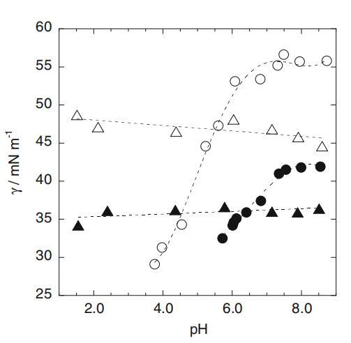 圖3 CS=1.0和25mm時界面張力(γ)與pH的關(guān)系圖:白色crcles 1.0mm SLAS,白色三角形1.0mm SDS,黑色圓圈25mm SLAS,黑色三角形25mm SDS