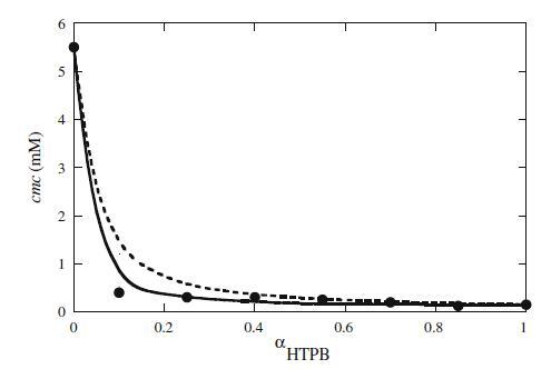 圖2 HTPB+Mega-10混合體系混合臨界膠束濃度(cmc)與αHTPB的關(guān)系圖。填充的圓圈表示實(shí)驗(yàn)cmc。虛線表示HTPB+Mega-10混合體系理想行為的相分離模型,而實(shí)線最符合RST和βmic 12的數(shù)據(jù)=?3.91