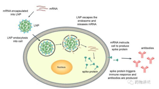 脂質(zhì)納米粒最新的成功案例是作為遞送載體用Pfizer/BioNTech和Moderna獲FDA批準(zhǔn)的兩種COVID-19信使RNA(mRNA)新冠疫苗,這兩款疫苗以無與倫比的速度開發(fā)上市,并在流行病毒預(yù)防方面有著顯著的效果。疫苗將編碼SARS-CoV-2刺突蛋白的mRNA遞送到宿主細(xì)胞的細(xì)胞質(zhì)中,被翻譯成刺突蛋白充當(dāng)抗原,對病毒產(chǎn)生免疫反應(yīng)。