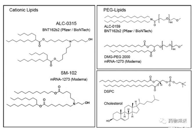 兩款mRNA疫苗采用的脂質(zhì)納米粒組成非常相似。都含有可電離的脂質(zhì),該脂質(zhì)在低pH值時(shí)帶正電利于與mRNA靜電作用絡(luò)合,在生理pH值時(shí)呈中性促進(jìn)mRNA的遞送和釋放并減少潛在的毒性。都含有聚乙二醇化脂質(zhì),以減少血清蛋白的抗體結(jié)合和吞噬細(xì)胞的清除,從而延長全身循環(huán)時(shí)間。磷脂二硬脂酰磷脂酰膽堿(DSPC)和膽固醇形成穩(wěn)定結(jié)構(gòu)有助于包載mRNA。兩款疫苗的可電離陽離子脂質(zhì):PEG-脂質(zhì):膽固醇:DSPC的摩爾比分別為46.3:1.6:42.7:9.4(Pfizer/BioNTech)和50:1.5:38.5:10(Moderna)。脂質(zhì)納米粒的粒徑為80~100nm,每個(gè)脂質(zhì)納米粒中包含有約100個(gè)mRNA分子。