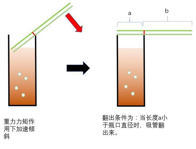 達(dá)到位置最高時(shí),速度為零,這時(shí),重力大于浮力,重力矩的作用下,加速傾斜。那么什么情形下,吸管會(huì)翻出來(lái)呢?顯然是吸管翻出時(shí),不被瓶壁阻擋時(shí),才可以翻出來(lái)。
