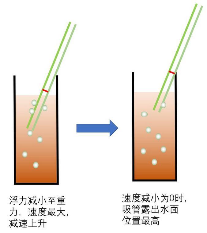這時(shí)上升過(guò)程中,吸管可能因?yàn)樽笥覂蓚?cè)吸附的氣泡數(shù)量不同而發(fā)生浮力差異而傾斜。也可能因?yàn)橥饨鐢_動(dòng)而發(fā)生傾斜,反正吸管豎直上升的可能性很小。習(xí)慣傾斜碰到瓶壁后繼續(xù)上升,上升帶來(lái)氣泡的減少,吸管自身浮力的下降。當(dāng)浮力減小到小于重力時(shí),這時(shí)開始i減速,直到速度為零。如下圖所示;
