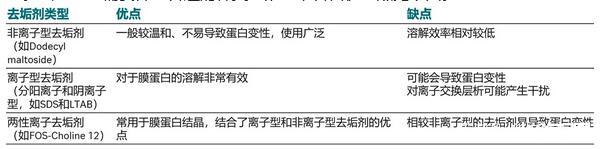 去垢劑的選擇:去垢劑別名表面活性劑、乳化劑、肥皂等等,分為離子型、非離子型和兩性離子型三類。去垢劑是同時(shí)具有親水性和疏水性基團(tuán)的雙極性分子,能夠使磷脂雙分子層解體并釋放膜蛋白,并且為去膜狀態(tài)下的膜蛋白提供穩(wěn)定的疏水環(huán)境。去垢劑也需要篩選合適的種類和濃度,各自優(yōu)缺點(diǎn)見下圖。
