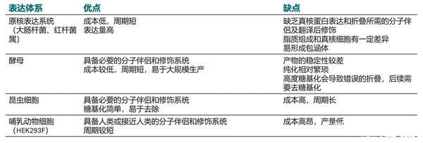 膜蛋白的表達(dá)系統(tǒng):原核表達(dá)(大腸桿菌、紅桿菌屬)、哺乳細(xì)胞(HEK293F)、酵母表達(dá)、昆蟲細(xì)胞表達(dá)。不同的表達(dá)系統(tǒng)的優(yōu)缺點(diǎn)見下圖。