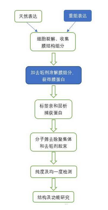 藍(lán)色背景分別是表達(dá)系統(tǒng)與去垢劑的選擇,是整個流程中至關(guān)重要的步驟。