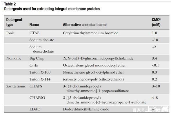 當(dāng)篩選去垢劑時(shí),要注意每個去垢劑的臨界膠束濃度(CMC)。CMC是指自由的去垢劑分子形成膠束結(jié)構(gòu)需要的濃度。因?yàn)槿芤合喈?dāng)于膜蛋白從細(xì)胞膜上去除進(jìn)入去垢劑膠束,所以CMC是蛋白提取所需的最低濃度。CMC值可參考表二。